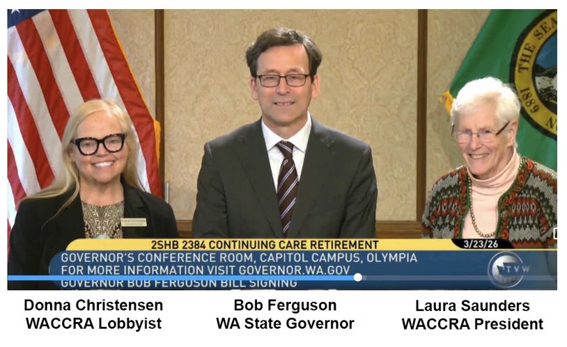 On Monday, March 23, 2026, Governor Ferguson signed into law House Bill 2384 making Washington one of a handful of states that have their insurance departments review the actuarial soundness of CCRCs. Laura Saunders, WACCRA President, and Donna Christensen, WACCRA’s Legislative Consultant, were there to represent all WACCRA members at this important moment in WACCRA’s history. WACCRA worked hard to get this bill passed.